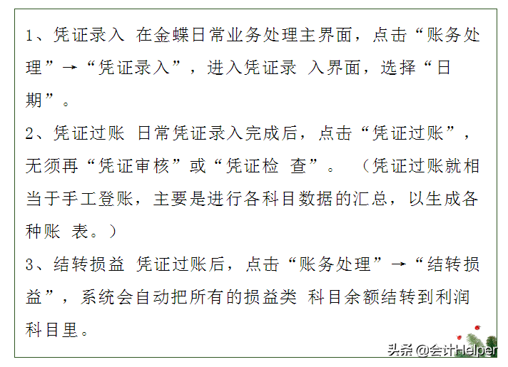 选择软件→建立账套→设置科目和辅助核算→录入期初余额→设置凭证种类录入凭证→生成或录入期末结转凭证→审核凭证→记账→结账→生成财务报表。