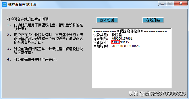 第二步:插上税控盘,点击“版本检测”,如果设备版本低于1103版本,点击“在线升级”将税控盘底层升级到最新版本1103。