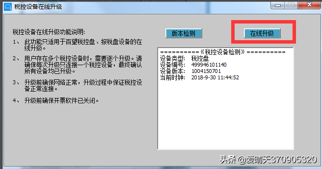 3.税控设备在线升级,进行版本检测,点击在线升级。(若升级过程出现问题,提示格式化,点否。之后出现盘不识别的情况。请转至附录1处理方法)