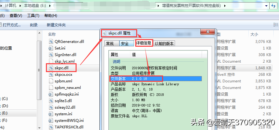 1.点击税字图标右键“属性”-“打开文件位置”,找到skpc.dll文件,右键“属性”-详细信息,查看文件版本。如skpc.dll版本是2.1.0.18,将软件覆盖安装后可正常使用。