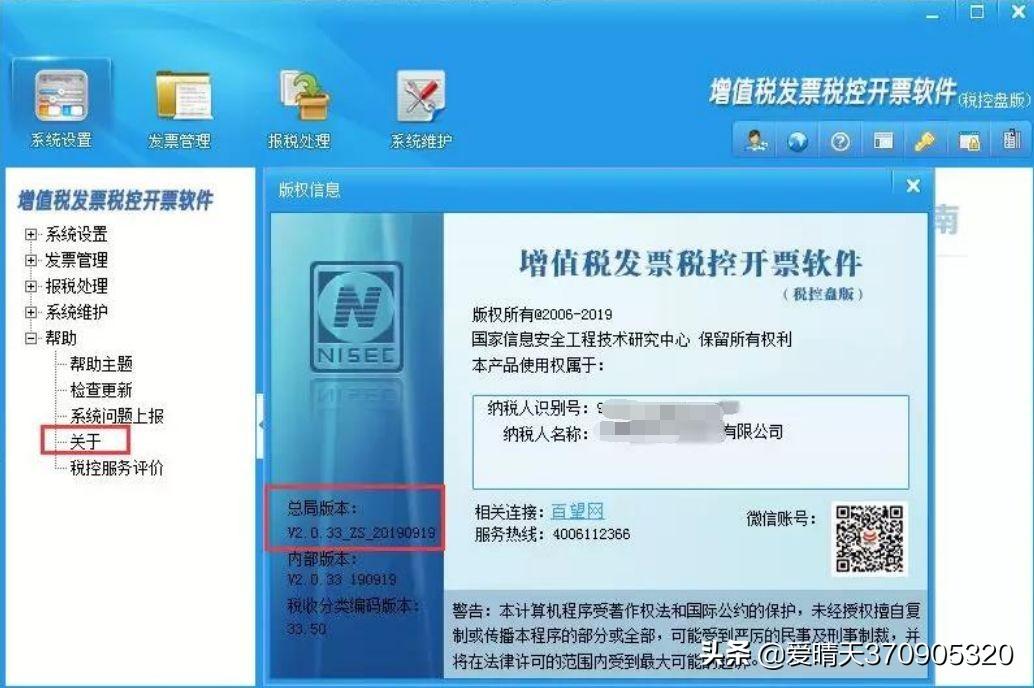 打开【帮助】-【关于】页面,左下角显示总局版本:V2.0.33_ZS_20190919即为升级成功。