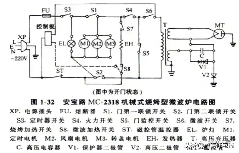 微波炉里有三个小电动机。电机的电路符号,在本图里是园圈里加m字。文字符号就是m。三个电机分别在: