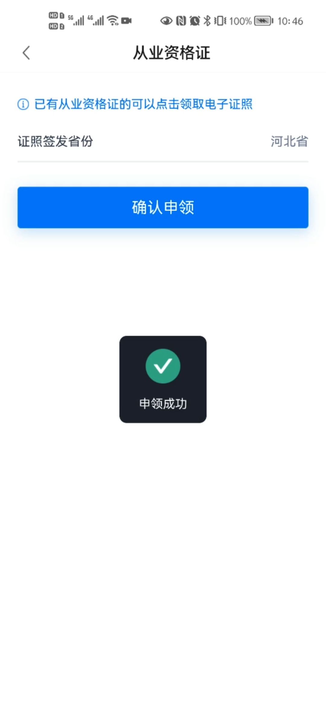 选择证照签发省份,点击确认申领,完成证照申领并进入证照列表。