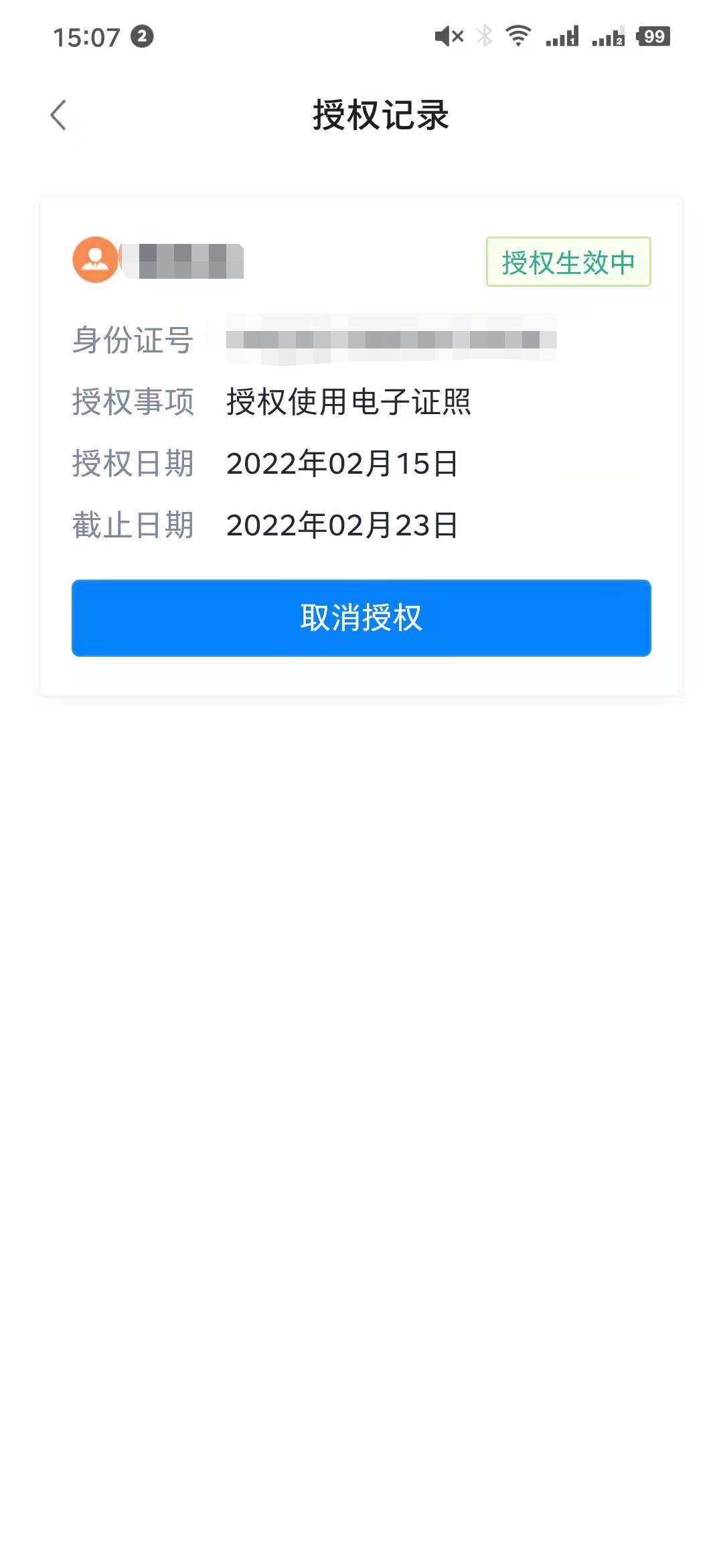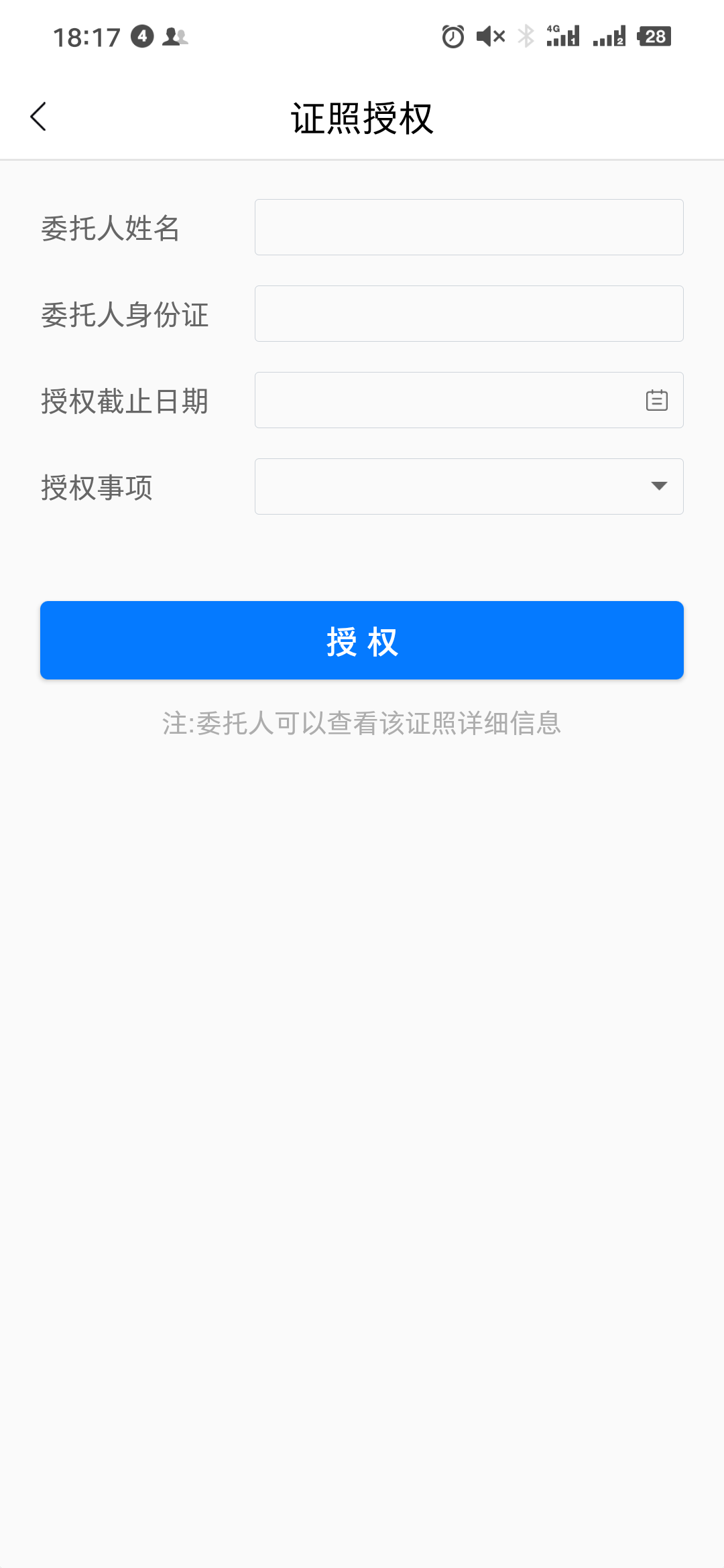 点击右上角菜单,点击【发起授权】,输入对应用户姓名、身份证、授权日期、授权事项给其他用户进行证照授权。