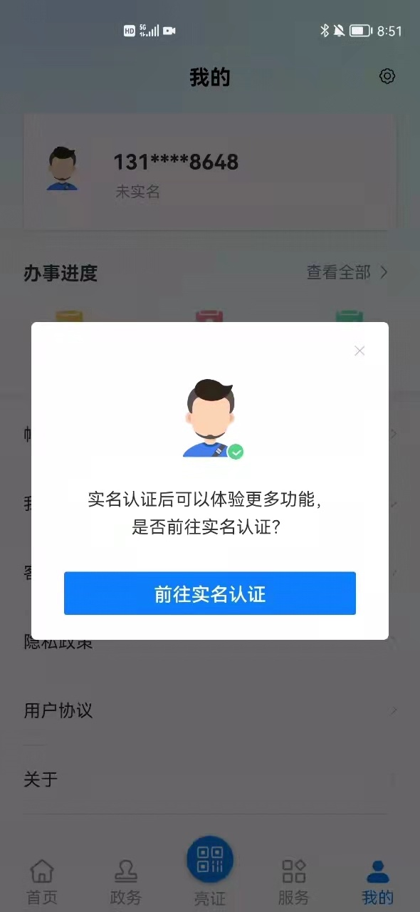 用户完成登录后,提示用户进行实名认证。点击【前往实名认证】进入实名认证流程。