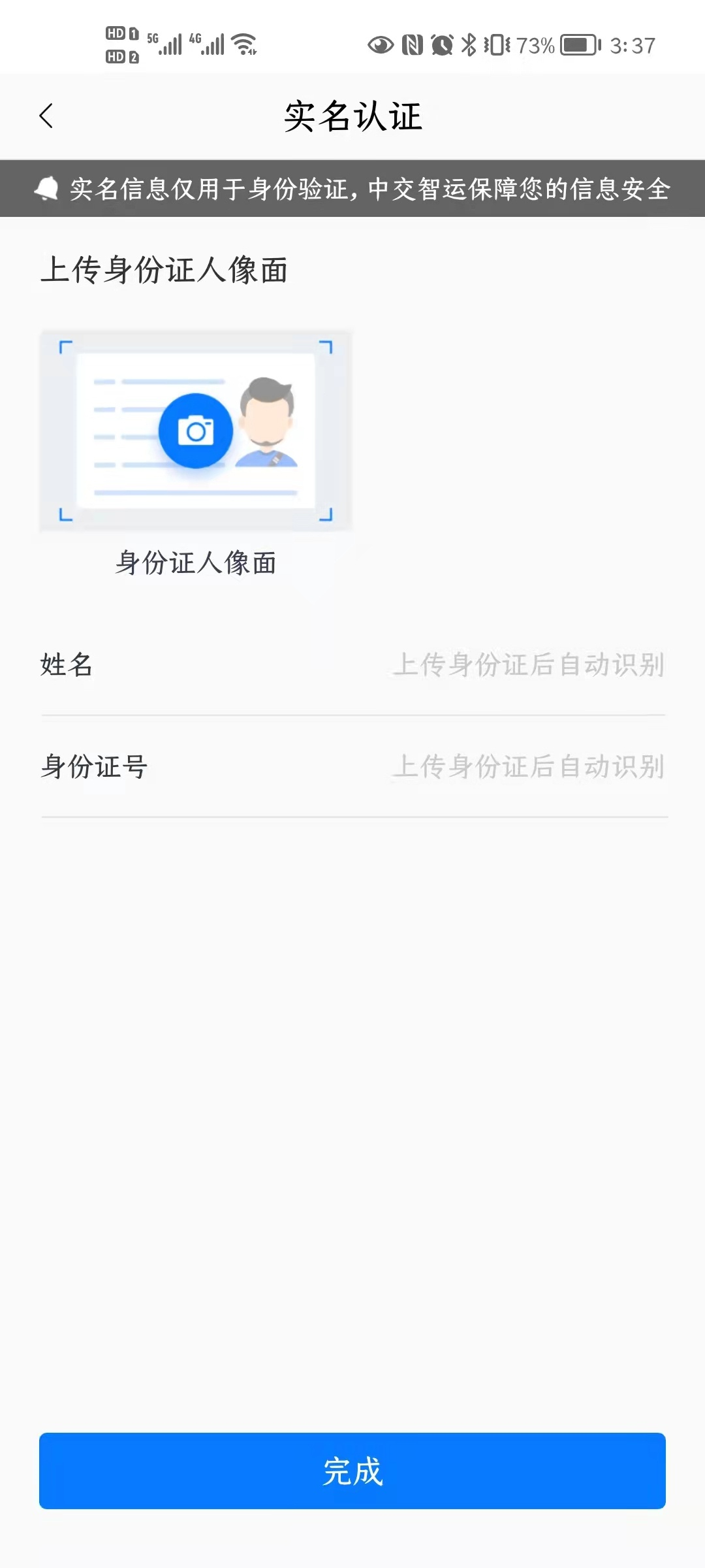 上传身份证,完成身份认证。