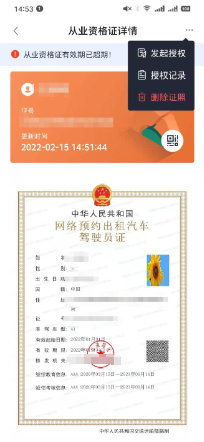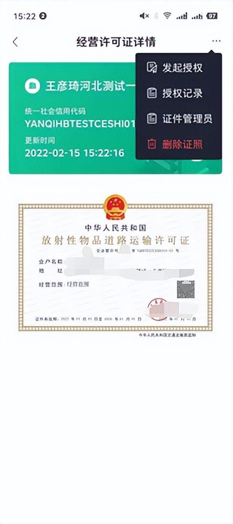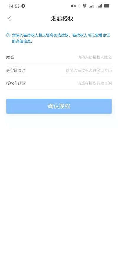 点击右上角菜单,点击【发起授权】,输入对应用户姓名、身份证、授权日期给其他用户进行证照授权。