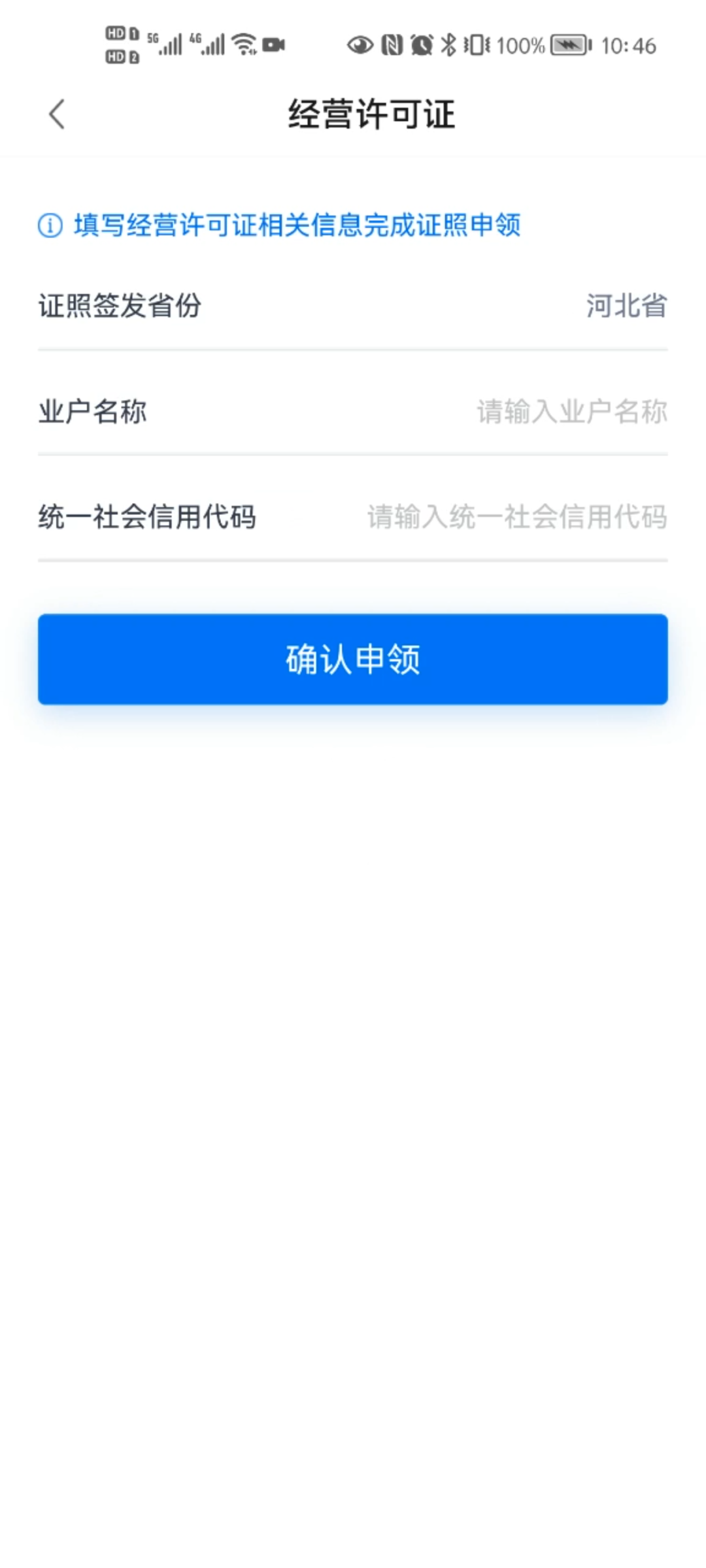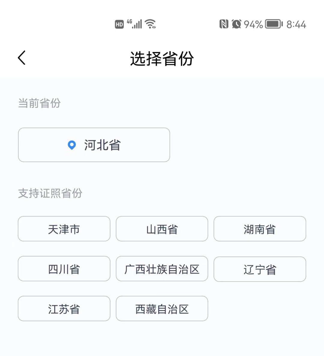 进入APP后需要选择证照签发的省份【河北省】。
