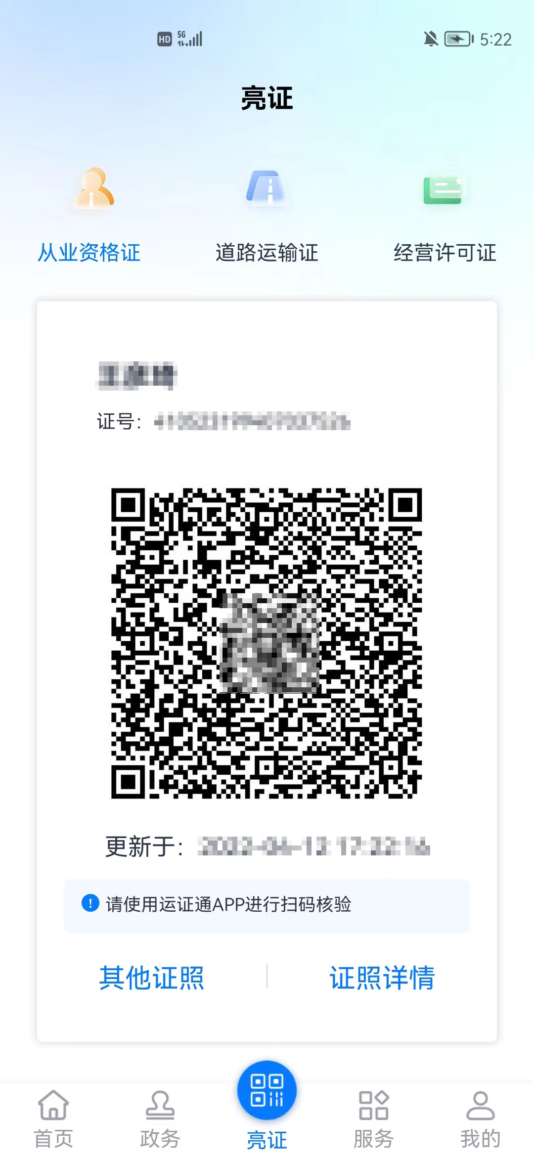 点击亮证进入二维码亮证页。选择不同的证件展示不同的二维码。点击证照详情,跳转到证照详情页。