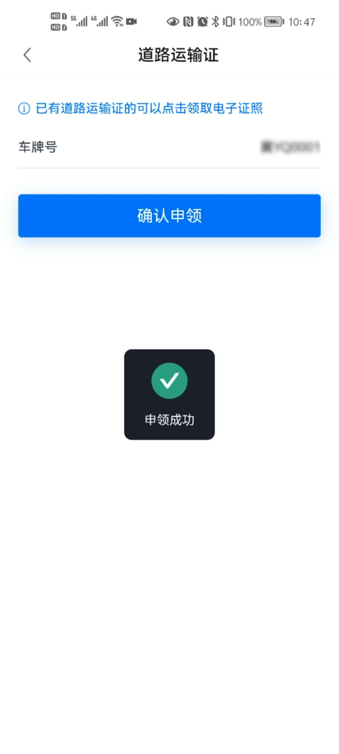 客货运车辆、巡游车车辆业户或车主选择已申领的经营许可证电子证照,输入车牌号,领取对应道路运输证。