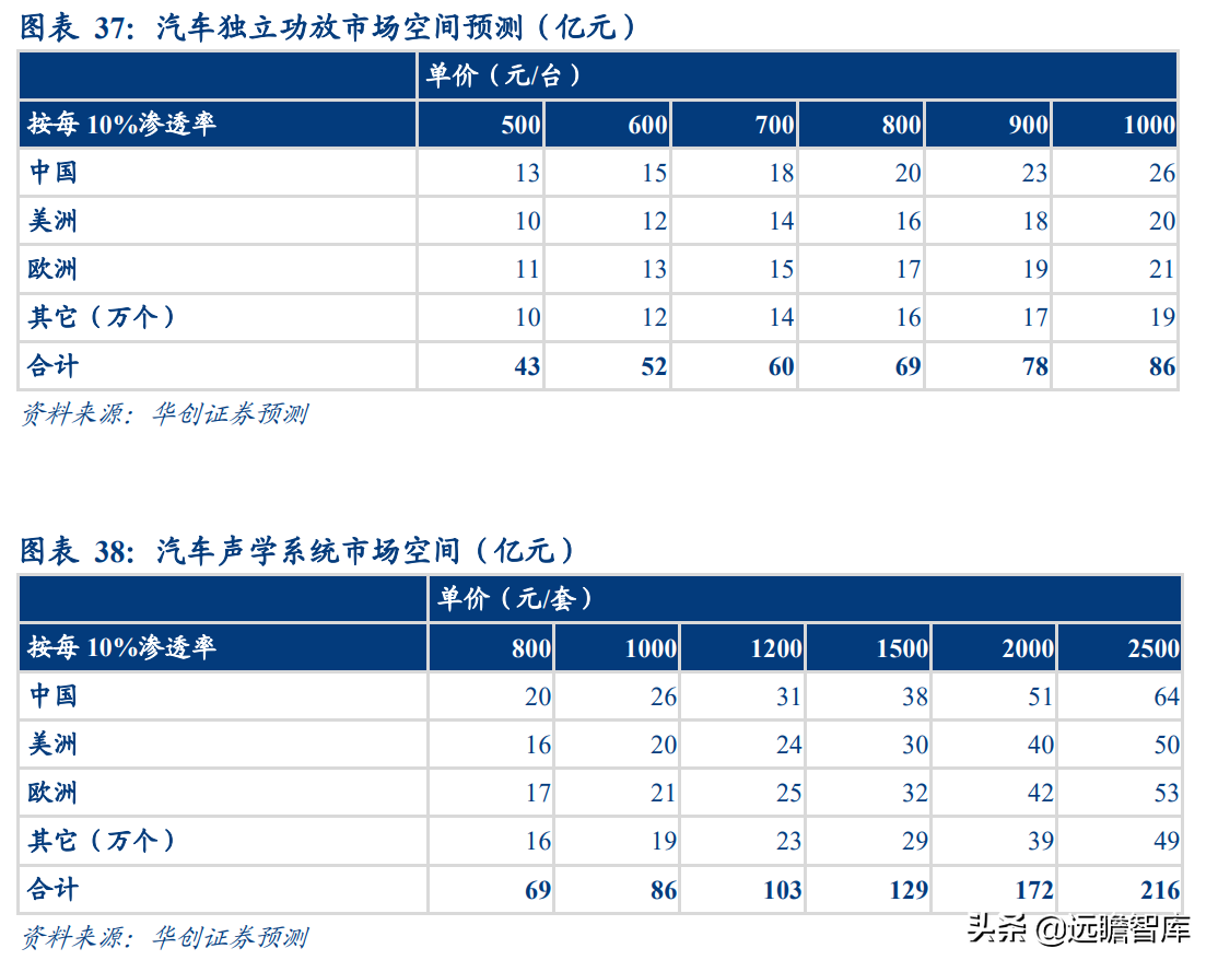 一个功放对应一套声学系统,按照相同的逻辑,每 10%渗透率提升,1200 元单价的声学系统对应 103 亿元市场空间,高端 2500 元单价声学系统对应 216 亿元市场。