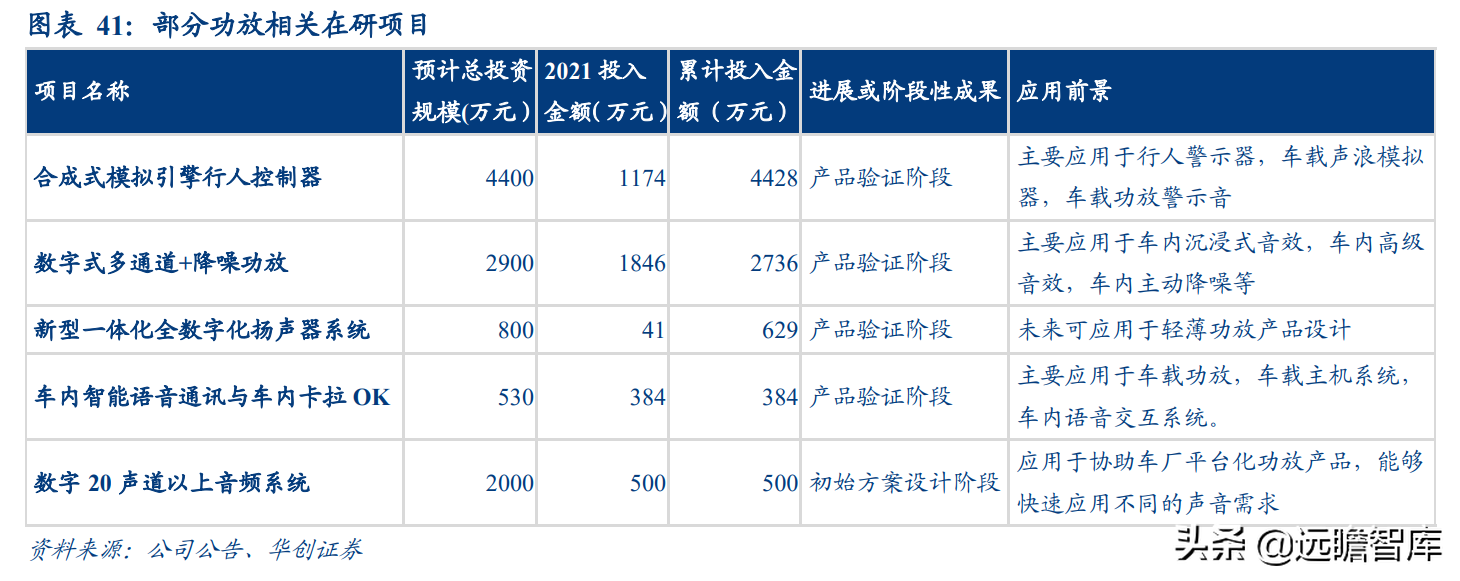 在研项目方面,合成式模拟引擎行人控制器将用于车载功放警示音,新型一体化全数字化扬 声器系统未来可应用于轻薄功放产品设计,车内智能语音通讯与车内卡拉 OK 未来将用于车载功放。