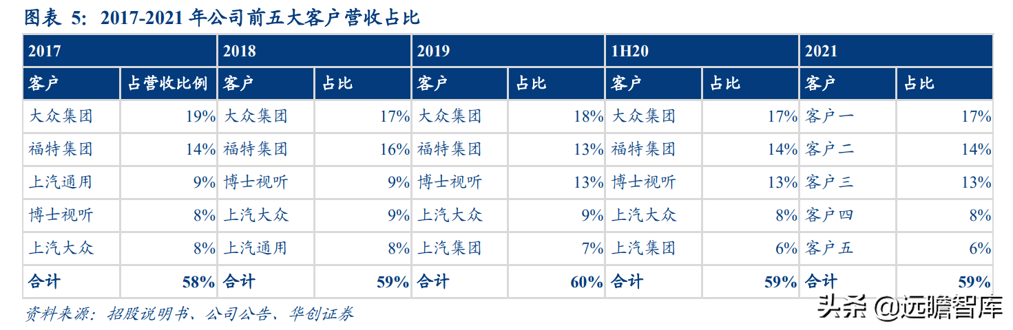 公司扬声器产品多以贴牌形式制造或代工直供车企或电声品牌商,与大众、福特、博士视听、通用拥有多年合作经验,先后获得福特集团 Q1、大众集团 A 级、通用集团 BIQS 等质量认证。2017-2021年前五大客户营收占比稳定在60%左右,客户集中度较高。