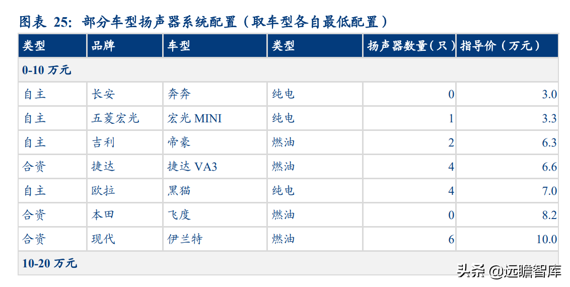 具体地: 对于 30 万元以下车型,单车扬声器配套数不超过 10 只,与车型价格呈明显的正相关,其中 0-10 万元一般配 0-4 只,10-20 万元配 4-6 只,20-30 万元配 6-8 只,同时燃油与新能源、合资与自主之间的差异尚不明显。
