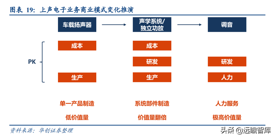 公司产品/业务从扬声器到声学系 统,再到调音,价值量随之走高,商业模式也从单一零件制造到系统部件制造,再到 人力服务,壁垒相应变化、投资回报也有望相应变化,是当前国内汽车零部件行业中 少有的三段模式变化型发展。
