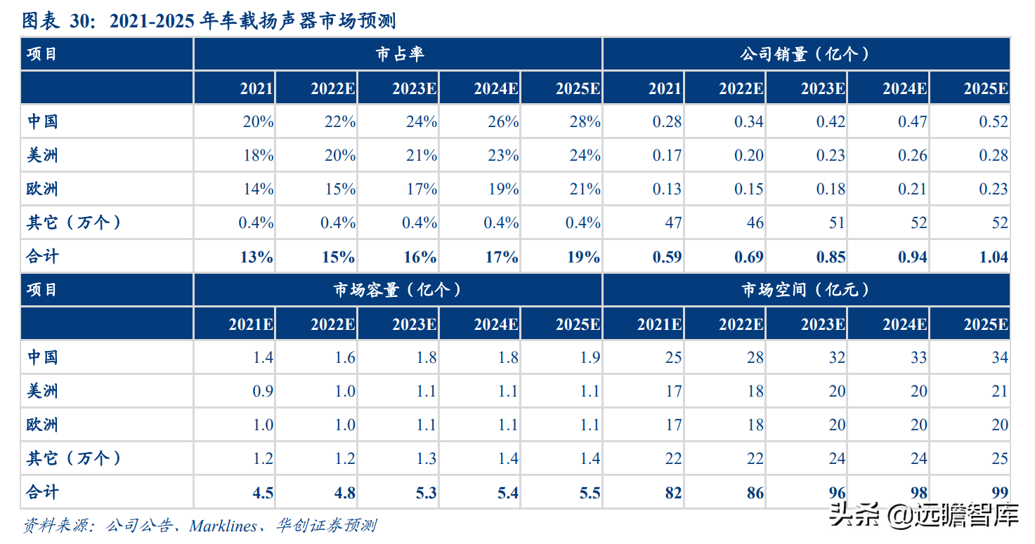 我们预测,随汽车行业恢复、车载扬声器增配,市场空间有望从 2021 年 82 亿元进一步扩容至 2025 年 100 亿元左右,随公司竞争力不断增强以及增量客户拉动,预计公司在中国、美洲、欧洲市占率将升至 28%、24%、21%,全球市场份额升至 19%。