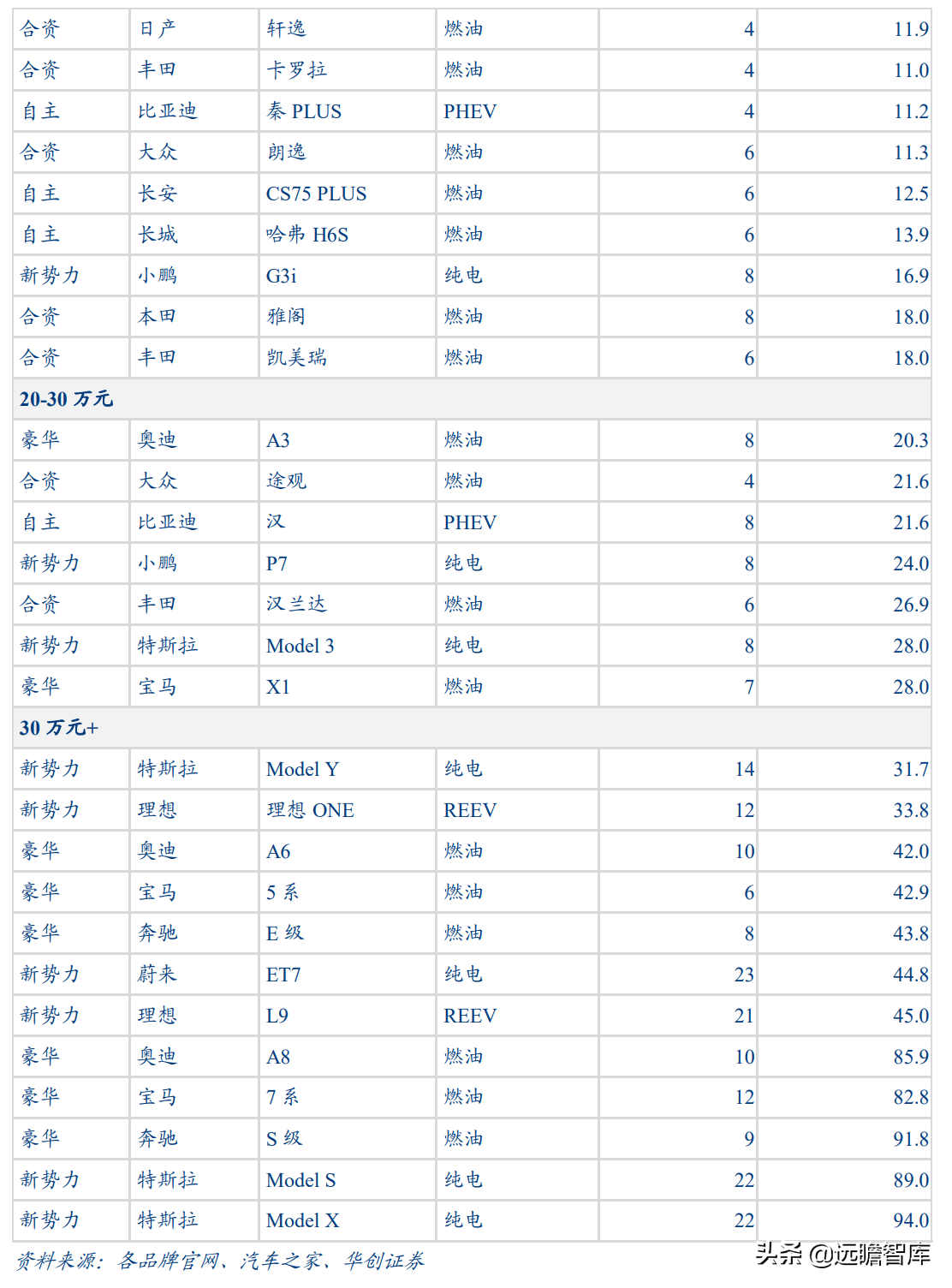 我们梳理了当前典型新能源车、燃油车扬声器系统配置情况,包括自主、合资、新势力、豪华车型(扬声器配套数量参考该车型的最低配置),可以看到:
