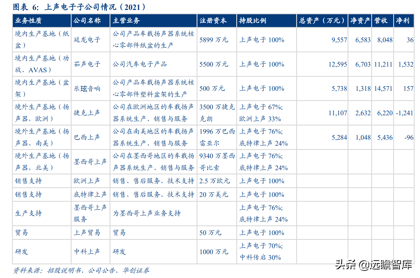 公司目前生产基地已实现全球布局。上声电子在国内外有 6 个生产基地子公司,分别为境内的延龙电子(上声电子持股 100%,生产纸盆)、乐玹音响(100%,盆架)、茹声电子(100%,功放、AVAS),以及境外扬声器生产基地捷克上声(67%)、巴西上声(76%)、墨西哥上声(76%)。2017 年公司与中科长启合资设立中科上声,公司持股 70%,主要致力于声学信号处理方向相关算法及软件的研究和其他技术难题的攻关。