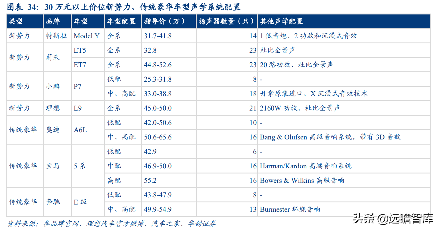 1) 传统豪华车企在低配车型中会使用白牌扬声器且数量配置较少,在中高配车型上往往会使用品牌声学系统来满足部分消费者的溢价诉求,但定价往往处于 50 万元以上。