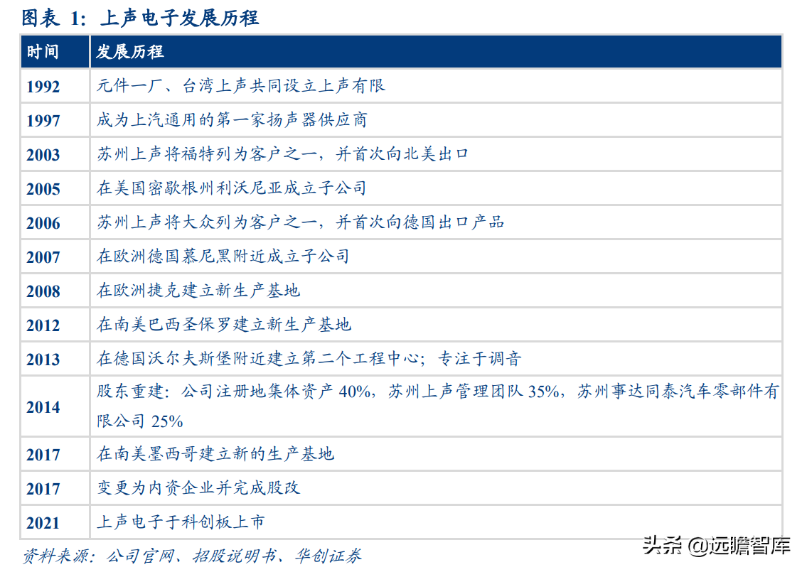 公司成立于1992年,主要研发制造车载扬声器,1997年成为上汽通用的第一家扬声器供应商,帮助合资车企较早实现车载扬声器国产化,2003年首次向美国福特出口产品,2005年于美国密歇根成立第一家海外子公司,2017年完成股改,2021年4月,公司于科创板上市。