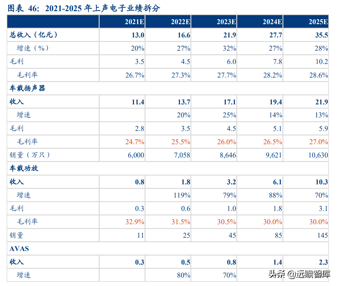 预计 2021-2025 年公司功放业务营收分别为 0.8 亿、1.8 亿、3.2 亿、6.1 亿、10.3 亿元。 2021 年公司功放销量 11.4 万只,合计营收 0.8 亿元,同时新获蔚来新车型、理想、零跑、 华为金康、华人运通的声学系统配套定点信,预计在未来 1-2 年放量,随着新能源汽车景气度上升,公司声学系统业务有望获得滚动订单支撑。