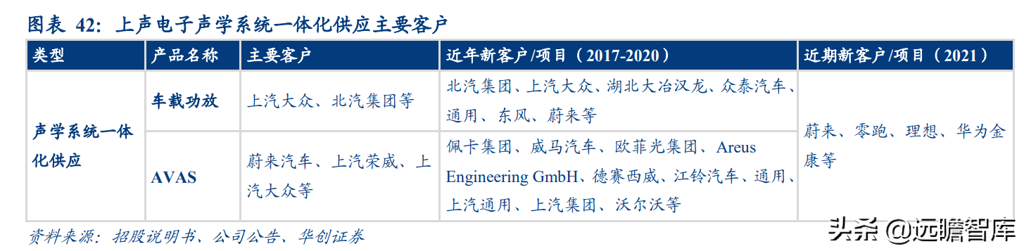 随消费升级、智能电动车推广,我们看好扬声器、功放等汽车声学部件增配进而行业扩 容。上声在车载扬声器领域处于龙头地位,在声学系统一体化配套上已实现在蔚来车型 上的量产,蔚来作为新势力、豪华车的代表客户,标杆效应明显,未来份额有望进一步 提升。