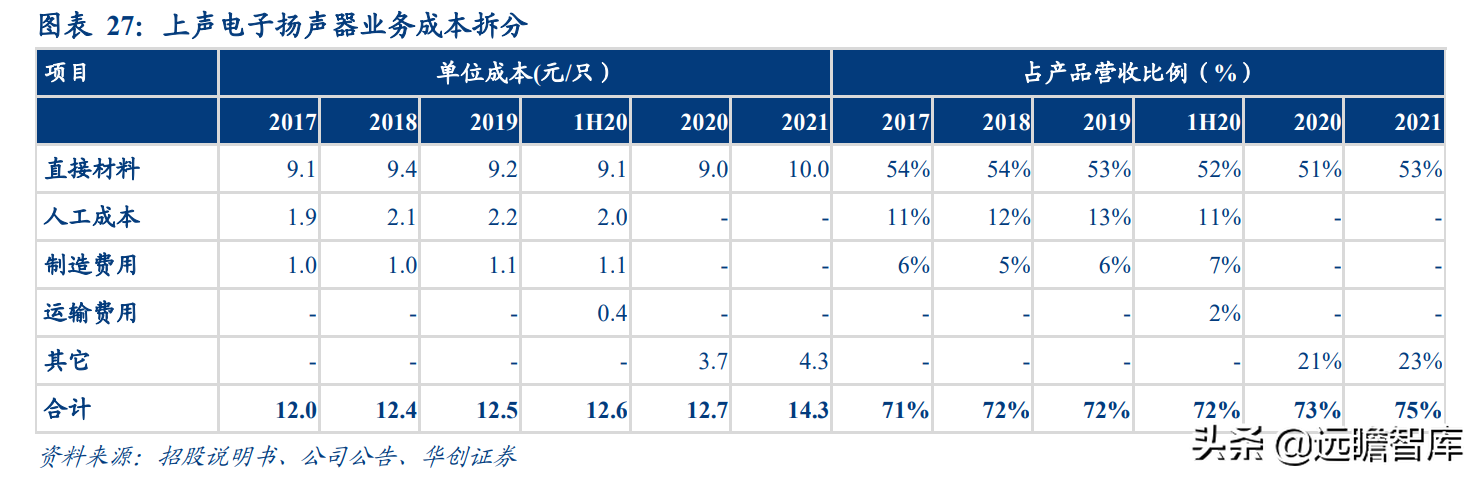 根据公司财务数据,扬声器业务营业成本占营收比例长期维持在 72%左右,其中原材料占比最大,超过 5 成,因此掌握低成本原材料渠道、制造能力极其重要。
