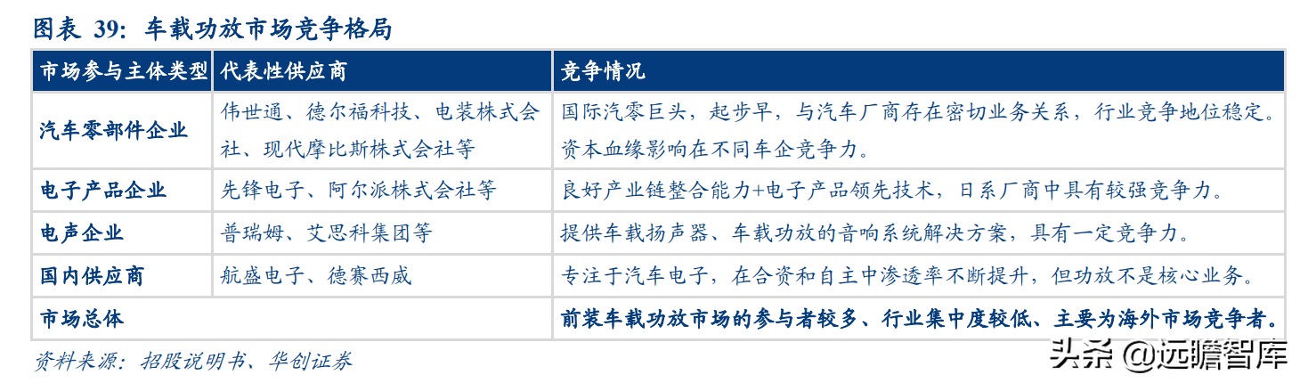 高端汽车声学系统供应商以外资供应商为主。声学系统核心部件车载功放市场参与者较多,主要为海外企业,有伟世通、德尔福、电装、现代摩比斯等汽车零部件企业,先锋电子、阿尔派等电子产品企业以及普瑞姆、艾思科等电声企业;国内参与者仅有航盛电子、德赛西威等几家,竞争对手有限。