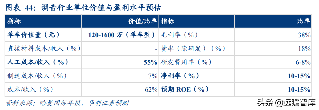 调音为汽车声学系统成型的最后一 步,由于汽车声学系统的特殊性及人耳对多声道系统的听觉特性,该环节商业模式以 人才主导,人力服务成本极高,单车型/项目调音收费可达到千万级别。