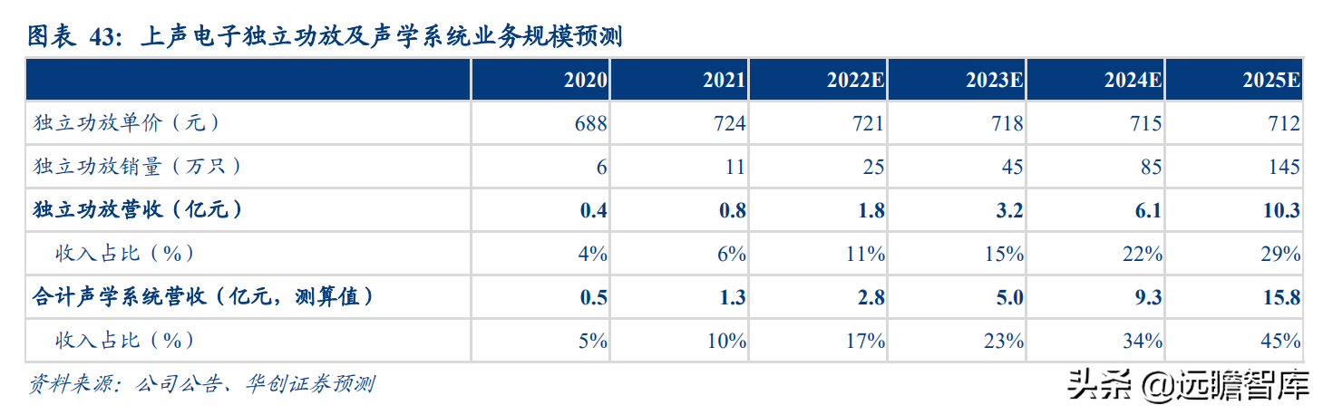 我们预测 2022-2025 年上声分别销售独立功放 25、45、85、145 万只,至 2025 年,公司 功放业务营收将达 10.3 亿元,营收占比从 2021 年约 6%提升至 29%。