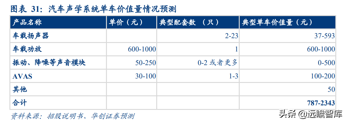 我们估计,配套独立功放、部分特殊声音模块的汽车声学系统单车价值在 787-2343 元之间,其中车载扬声器价值 37-593 元,车载功放价值 600-1000 元,振动、降噪等声音模块价值 0-500 元,AVAS 价值 100-200 元,其他部件假设为 50 元。