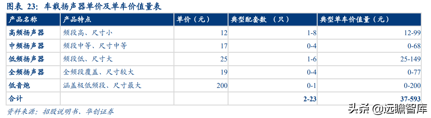 车载扬声器单车价值量随车型配置、配套数量变化,一般介于 40-600 元。不同价格带、不同配置车型扬声器配置数量差别较大:普通车型一般配套 1-8 个高频扬声器,单价 12 元,单车价值量约 12-99 元;中频 0-4 个,单价 17 元,单车价值量约 0-68 元;低频 1-6 个,单价 25 元,单车价值量 25-149 元;全频 0-4 个、低音炮 0-1 个,单车价值量约 0-77 元、0-200 元。