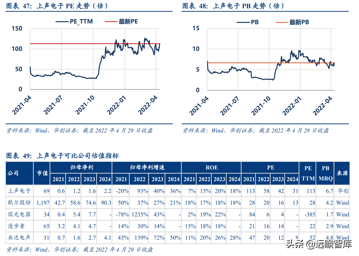随高端声学系统渗透率提升、上声电子份额及 ASP 提升,预计公司未来 4 年业绩复合增速有望达 50%,此外,考虑公司商业模式从单一产品制造发展至系统部件制造,未来有望进一步延伸至服务,研发要素权重提升、壁垒提升、ROE 有望提升,公司可以在一定程度上享受估值溢价。