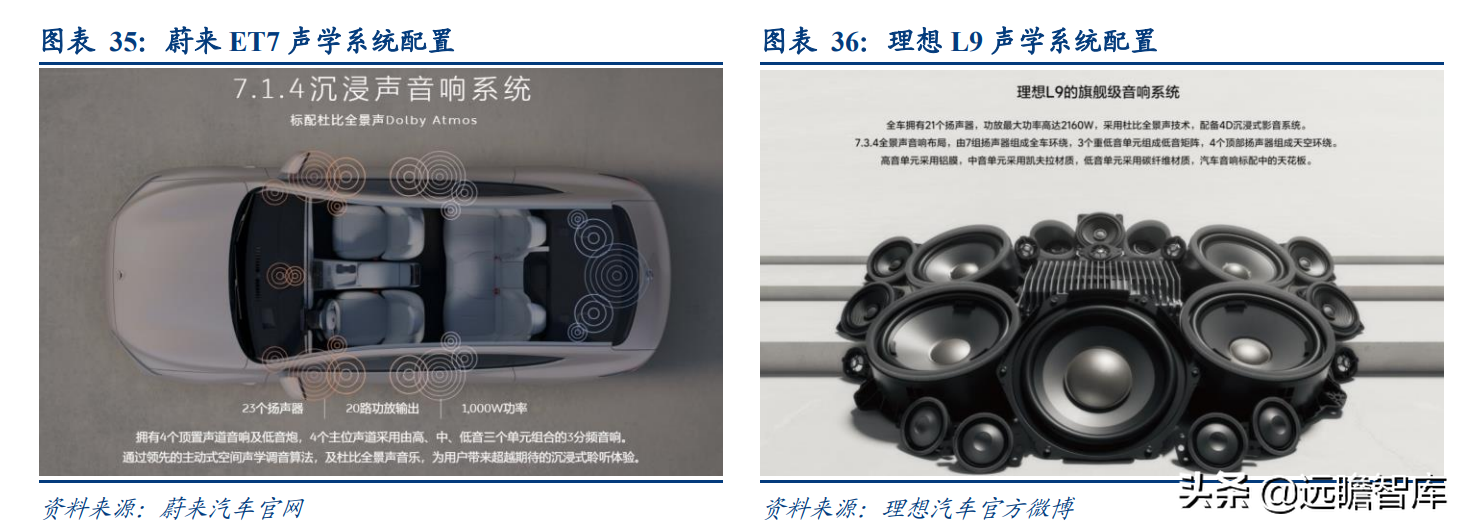 2) 高端车型市场竞争当中,以新势力为代表的智能电动车企对扬声器配置等级的重视程度明显高于传统豪华,蔚来、理想、特斯拉部分车型扬声器配套数已超 20 只。