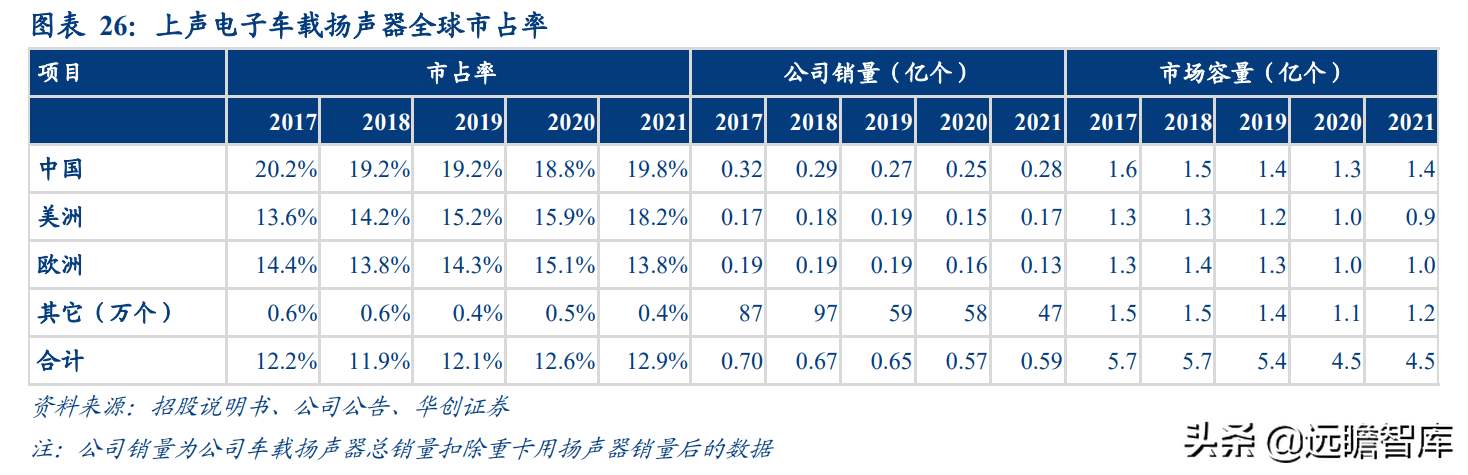 智能电动车推广+车型结构上移将推动车载扬声器装车数量增加,上声全球市场份额约 13%,国内份额第一。