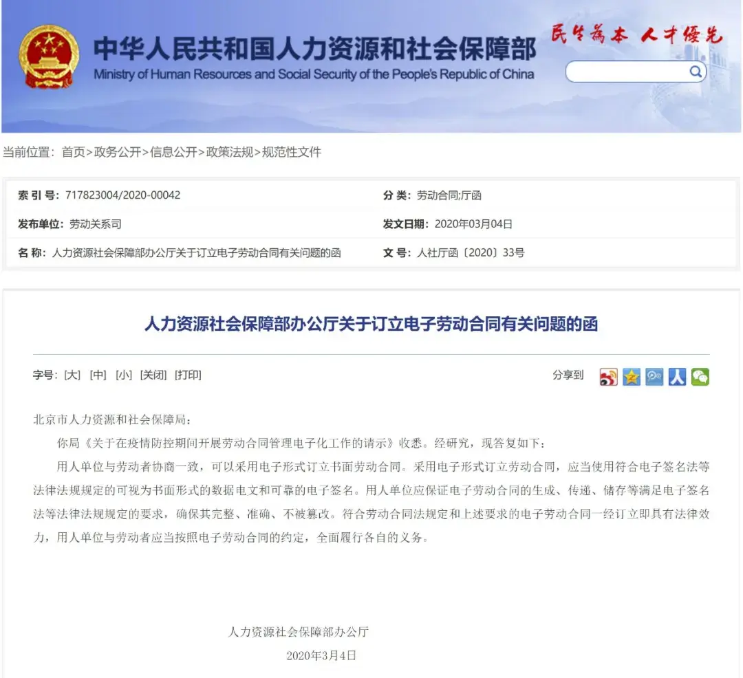 在互联网经济高速发展的今日,经电子商务与互联网金融的推动,电子合同已是常见,但对于传统企业而言,电子合同因使用形式复杂、保存困难等问题,使用程度仍远低于纸质版合同。此次受疫情影响,各地不得不推迟复工、减少线下活动,一时远程签订电子合同的需求迅速攀升。在以往很少使用电子合同的劳动人事领域,主管部门也出具了对电子合同的支持意见(见下附文件),预计未来电子合同在合同订立形式中的占比会大幅提高。