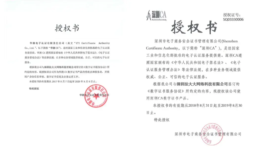 (以上图示为某电子合同平台在其官网上展示的华测CA授权证书与深圳CA授权证书,仅为举例说明,不作为任何平台推荐)