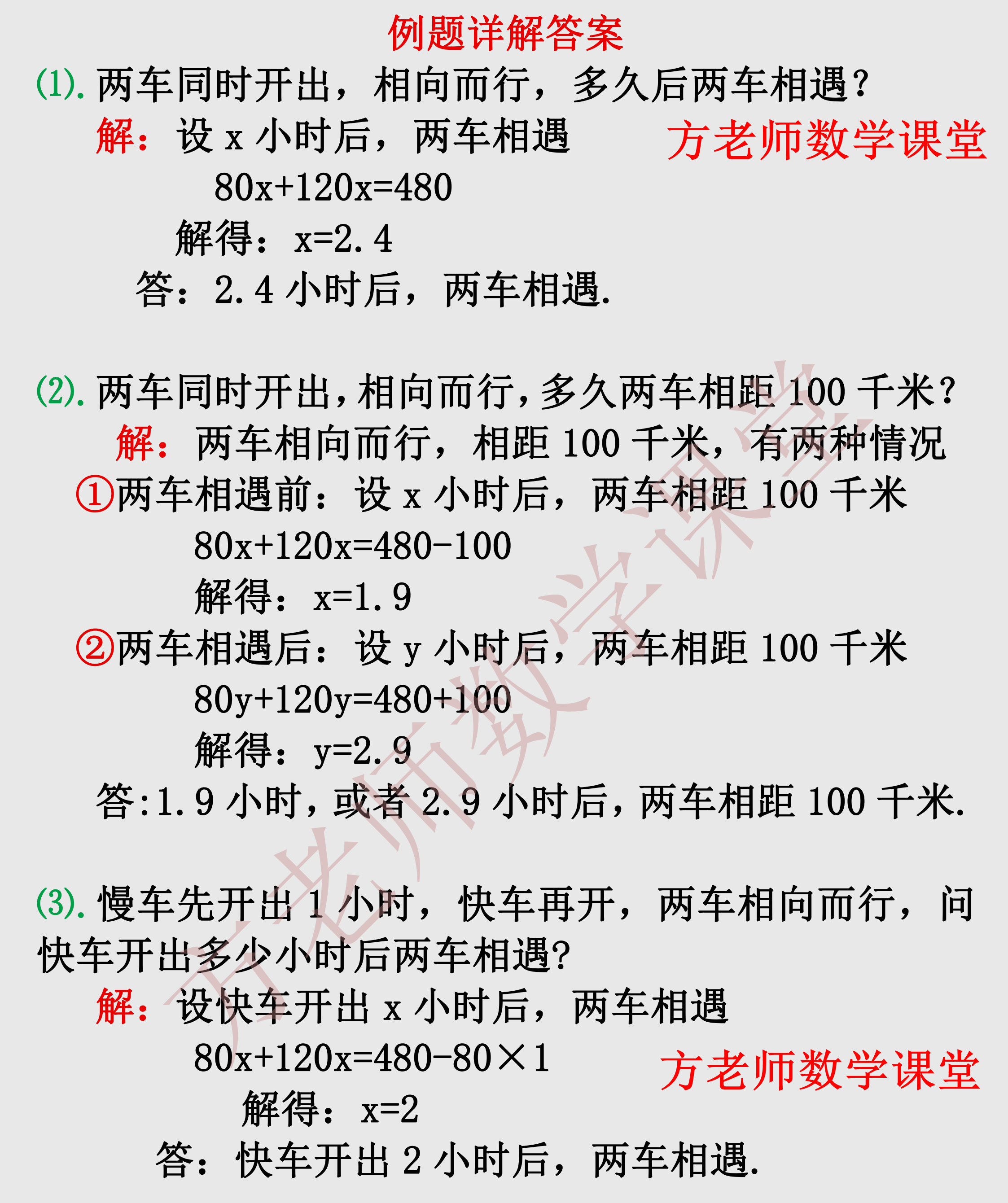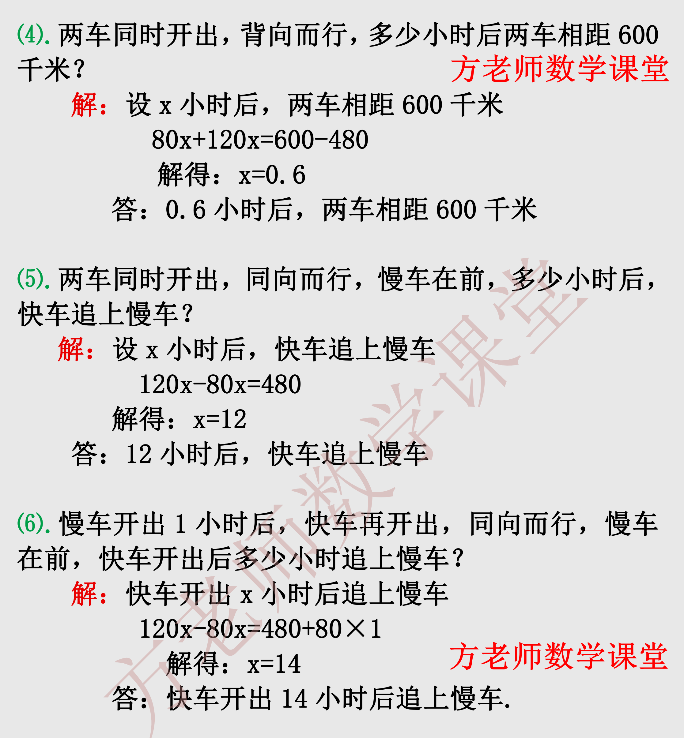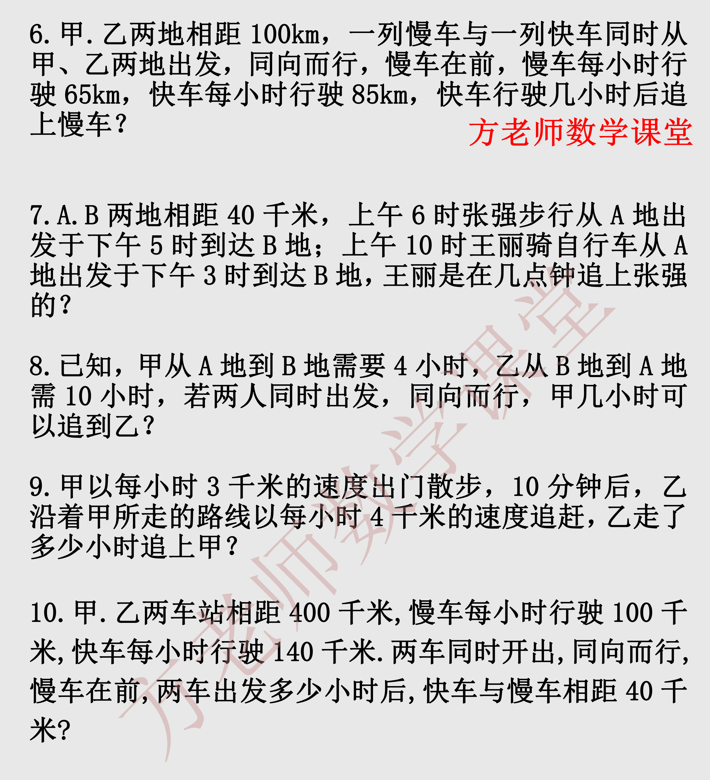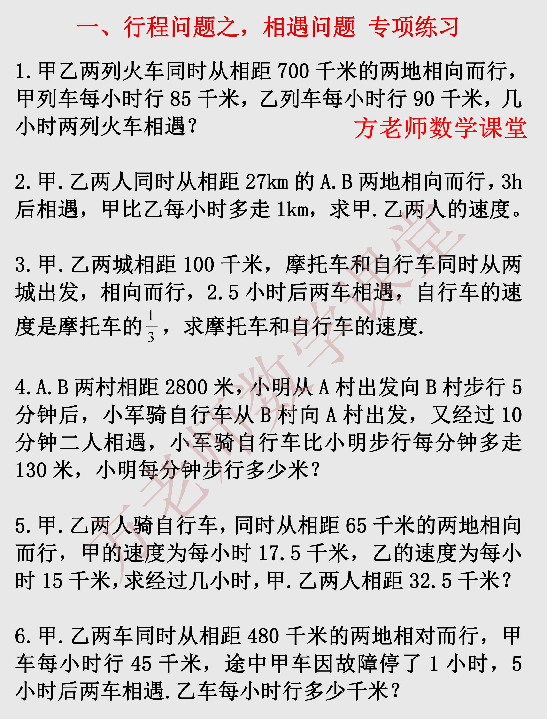 今天方老师汇编了一元一次方程行程问题这个专项练习。前面是《一大题9小题,相遇问题和追及问题专练》,有详细解题步骤。