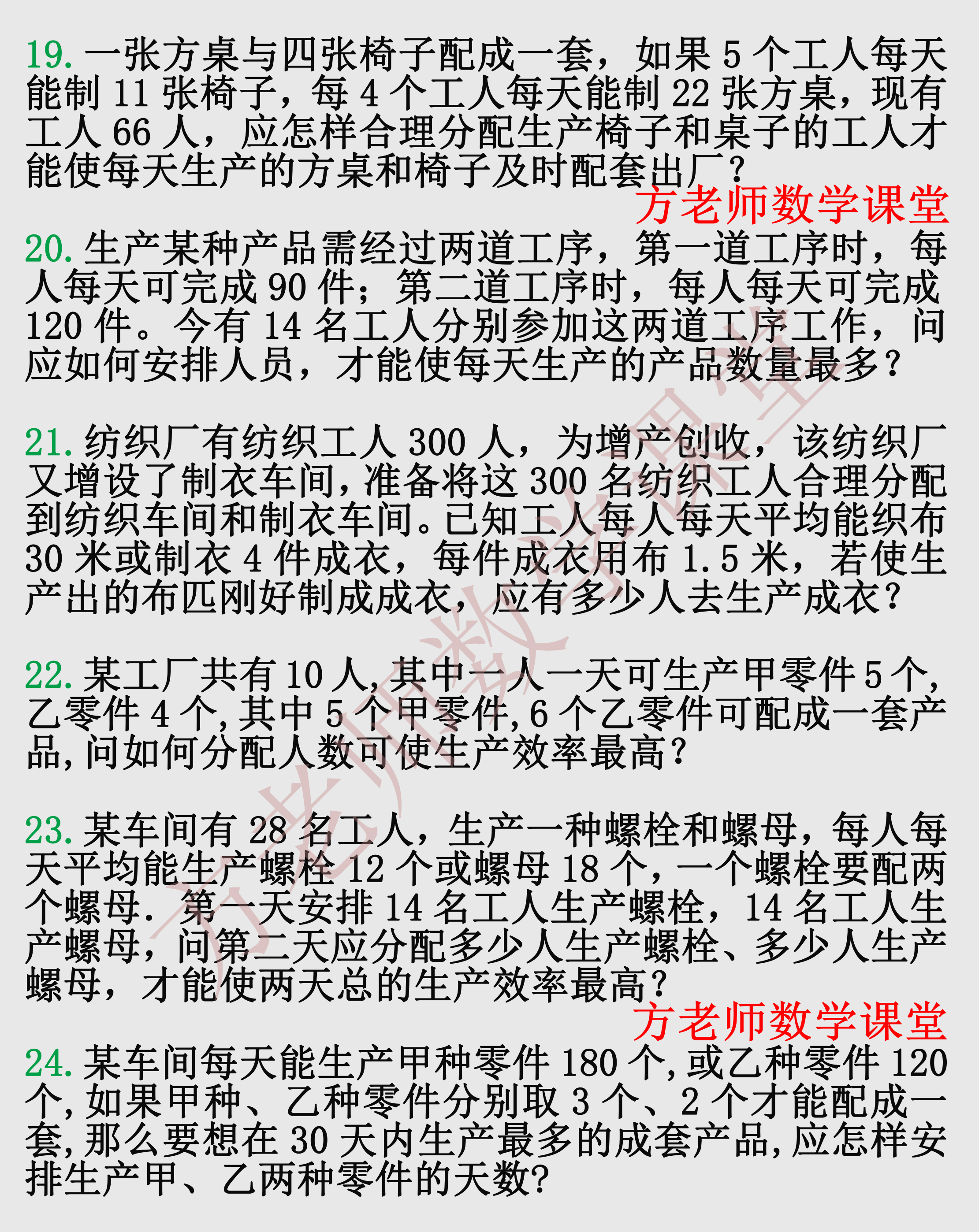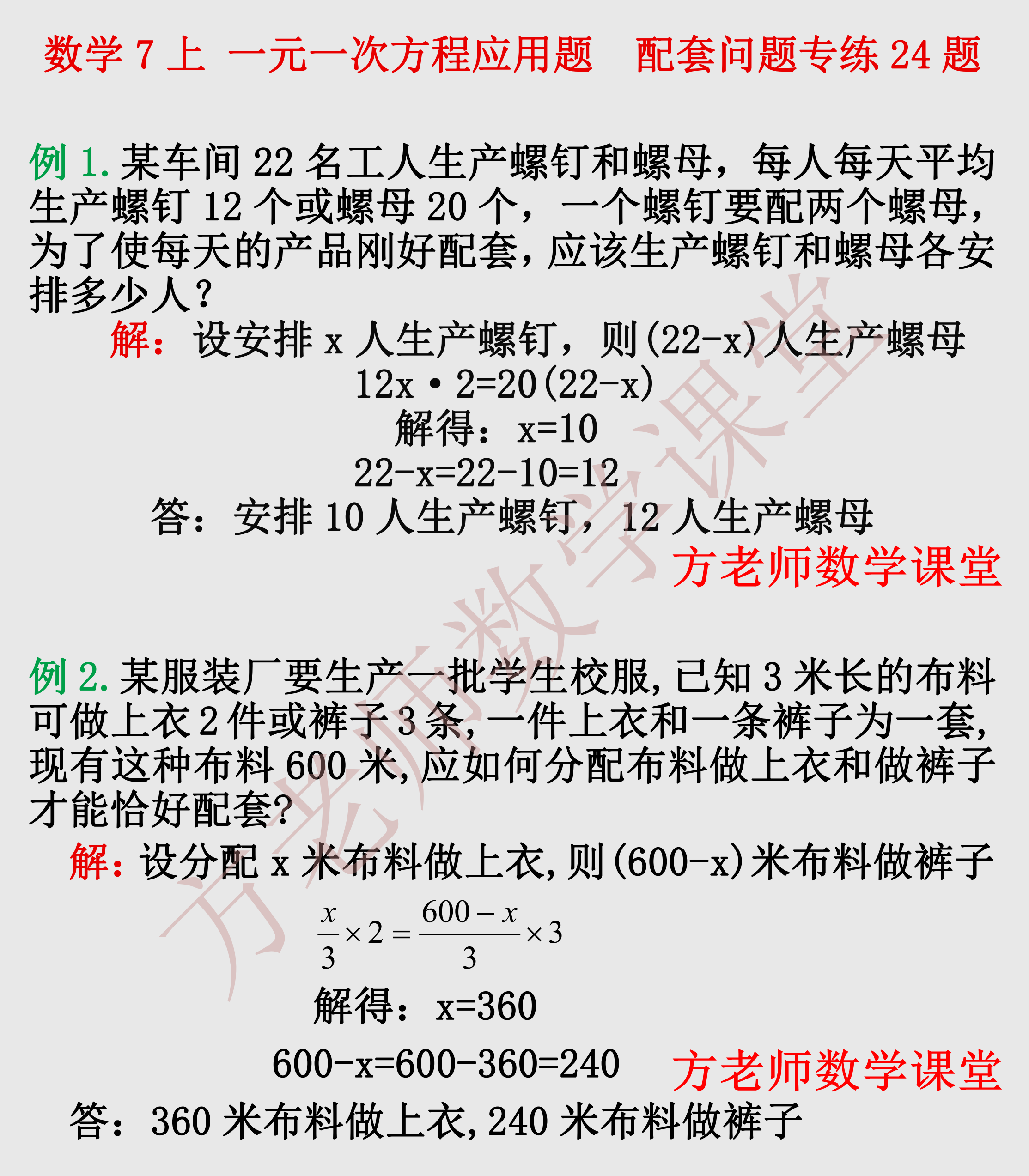 数学7上:配套问题,一元一次方程应用题专练24题,有详解可打印