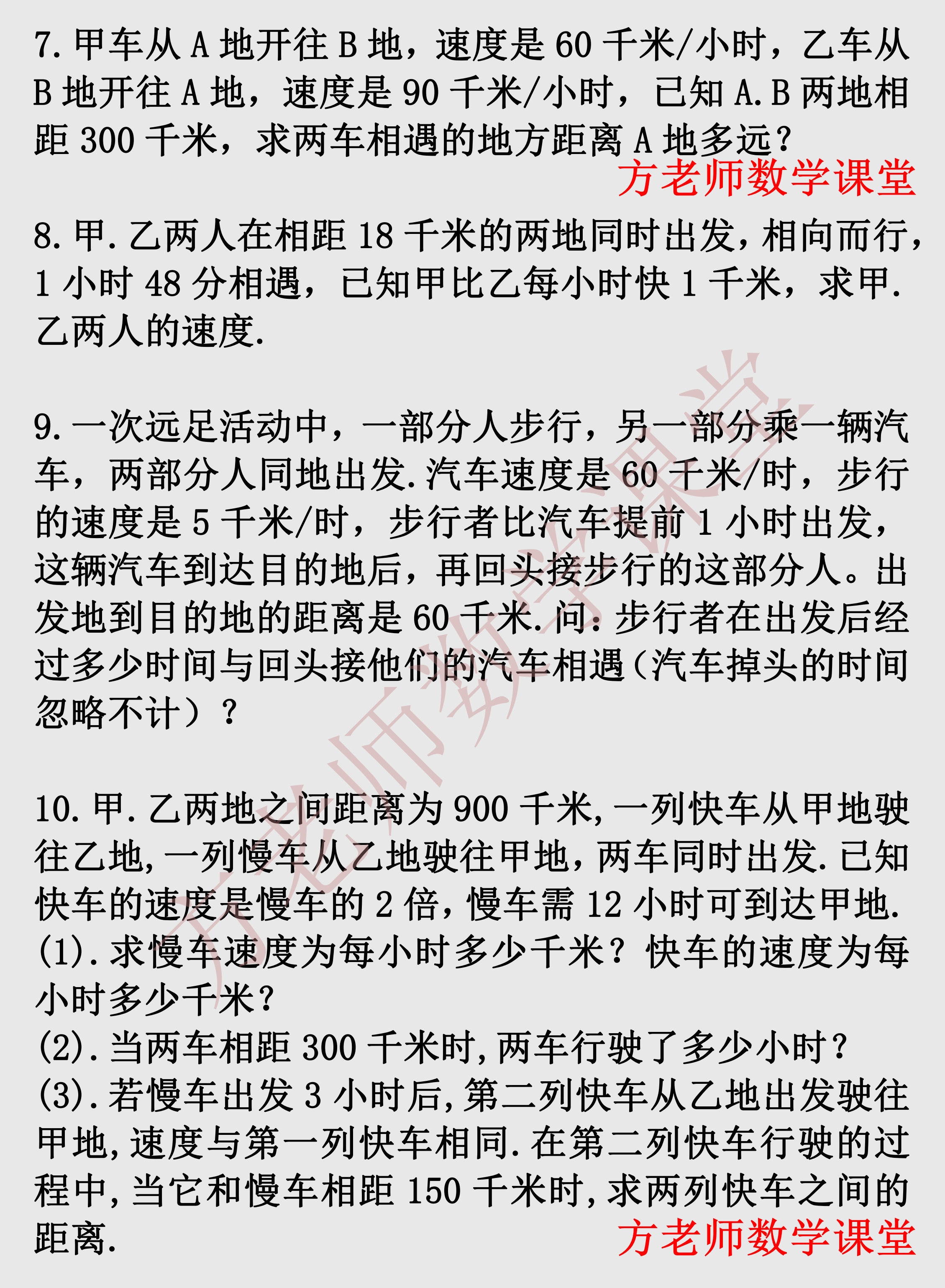 数学7上:一元一次方程行程问题30题,相遇和追及问题,可打印