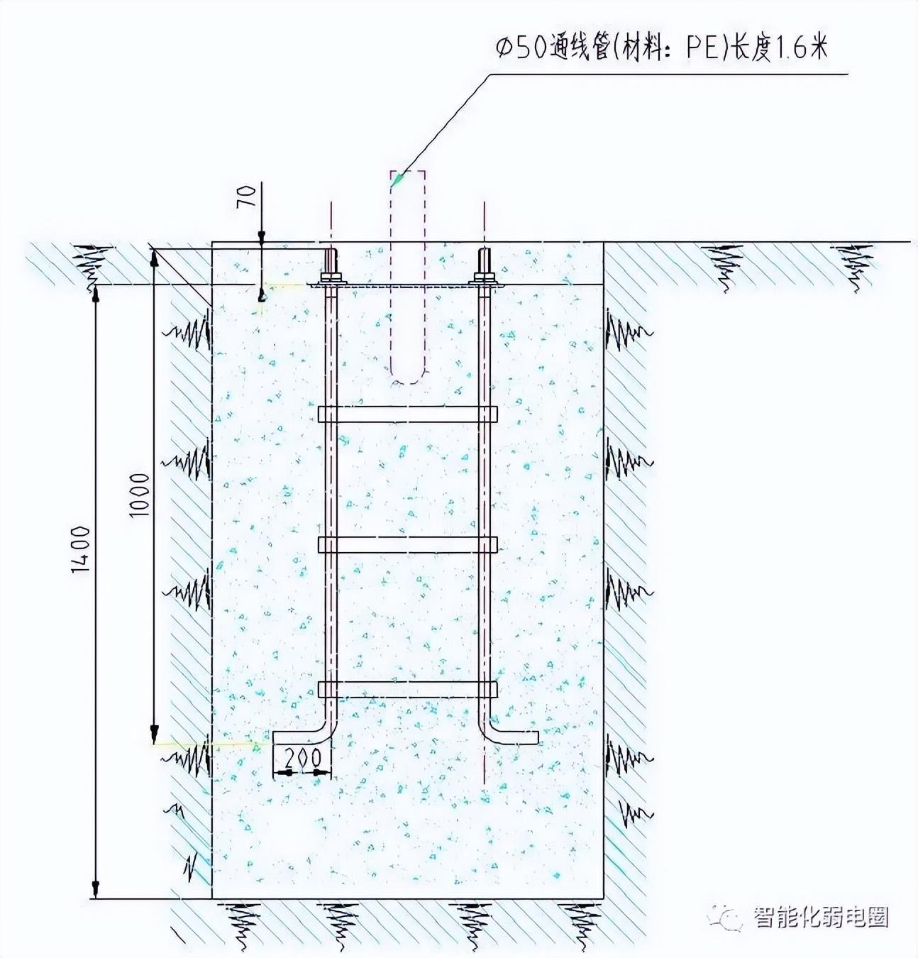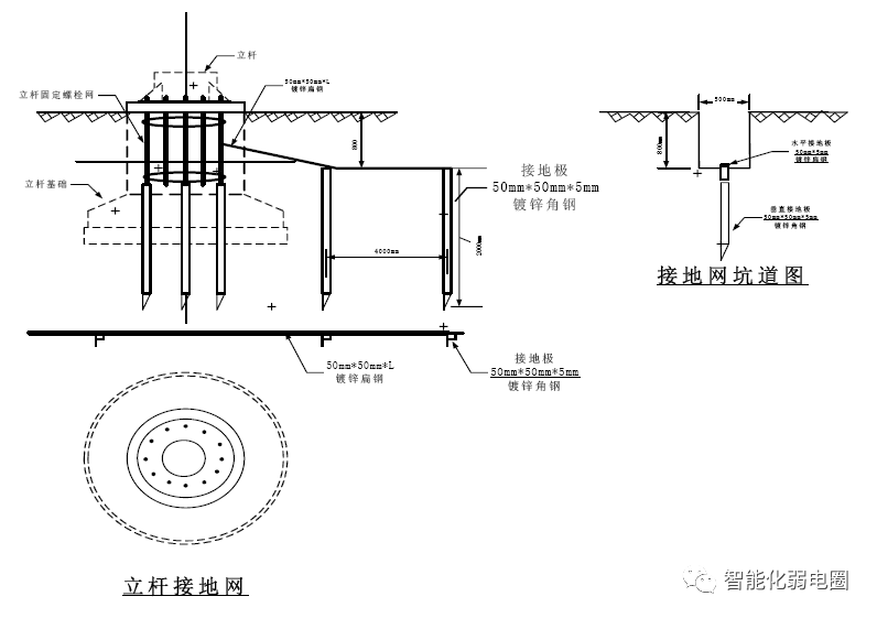 严格执行国家的有关标准和规范,立杆防雷接地电阻≦10Ω,接地网布置依据地形进行设计。立杆的基础由钢筋网加混凝土构成,首先用三根Ф50毫米的钢管或50*50*5mm的角钢作为接地极,同时用镀锌扁钢把四根接地极焊接形成接地网的一部分,再此接地网与法兰盘进行焊接,钢管或角钢经过热镀锌工艺处理,以增加抗腐性能和提高其导电性能。
