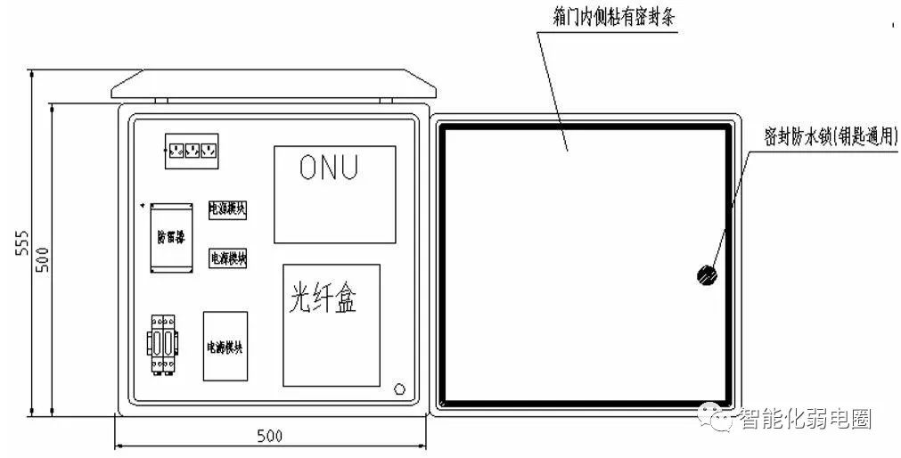 箱体采用1.2mm的不锈钢板,整体喷塑,然后丝印标志和文字。箱体技术要求如下:箱体的宽×高×深为500mm×400mm×250mm;一个箱体配备两个抱箍;箱体内部安装铝板,铝板上打孔攻丝,所有设备安装在安装铝板上;提供箱体内部安装设备的安装附件和安装螺钉;箱体安装防水锁,所有锁芯统一钥匙;整箱防水,箱门内侧粘有密封条,其密封条宽度应大于10mm,并具有一定的厚度,保证箱门的密封性良好;箱体外部丝印标志和文字。