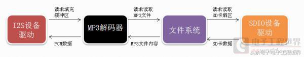 若按自顶向下的软件设计思路,I2S设备驱动以固定的节拍被唤醒,进行缓冲区PCM数据填充,因此需要定期去调用MP3解码程序。MP3解码器则根据前面一段解码操作的结果来决定是否要访问文件系统(因为MP3解码一块数据产生的PCM音频数据的量并不能刚好是I2S设备驱动请求的大小),以及需要读取多少字节的MP3文件内容,还有解码出来暂时用不到的数据也要保存起来下次用。到了文件系统这里,请求读文件的位置和长度也未必是正好SD卡上的一个扇区,所以也有缓存,而且还需要跟踪文件在SD卡上的索引。SDIO设备驱动则按照文件系统的请求读取SD卡,等待操作完成以后返回,注意它和前面的模块不同的是,有一段什么事情也不干的硬件IO等待时间。