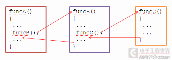我们知道,C语言的函数可以嵌套调用,可以递归调用。比如 funcA() 调用 funcB(),然后 funcB() 又调用 funcC(),甚至 funcC() 再调用 funcA() 都可以。但是 funcA() 必须等到 funcB() 返回之后才能继续执行它后面的内容,funcB() 调用 funcC() 也是等待 funcC() 完成了,控制权才回来。