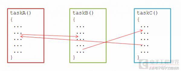 对于FreeRTOS的任务则不是这样的了,taskA() 任务可以在执行过程中主动或者被动地交出控制权,taskB() 可以这时候获得控制权,但它并不是从头再开始执行,而是从上次交出控制权的那个地方后面继续执行。又在某个时候,taskB() 交出控制权,系统选择了执行 taskC(),然后再当 taskC() 交出控制权时,taskA() 又恢复了执行。