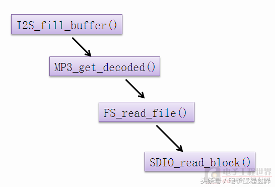 注意,每一次的函数调用,都代表一个完整的操作:填充一块缓冲区、解码一段MP3数据、读取一段文件,以及读取SD卡一块数据。下层的子程序被调用,完成后返回上一层的程序中继续执行。在没有异常(中断)发生的情况下,程序是不会离开这个调用关系嵌套的。