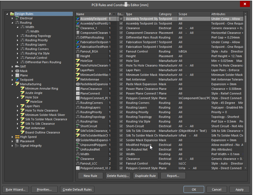 您确实使用的规则,尤其是用于制造的规则,应符合PCB制造商设备的规格和公差。诸如阻抗控制设计和许多高速/高频设计之类的高级设计可能需要遵循非常具体的设计规则,以确保您的产品正常工作。始终检查您的组件数据表以了解这些设计规则。如有必要,您可以按照Altium Designer的设计规则向导的步骤创建新的设计规则。