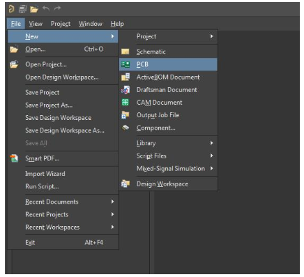 创建原理图后,您需要使用Altium Designer中的原理图捕获工具来开始创建PCB布局。首先,创建一个空白的印刷电路板文档,该文档将生成一个PcbDoc文件。这是通过Altium Designer的主菜单完成的,如下所示。