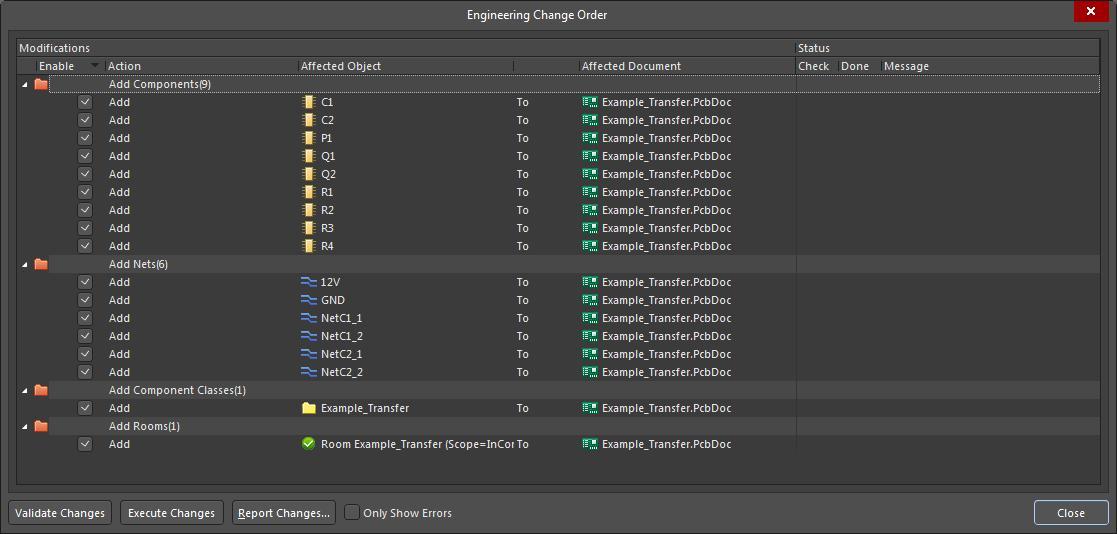通过单击“验证更改”选项卡来验证更改(将SchDoc信息无误添加到项目中)。如果所有项目的状态均为绿色,则单击“执行更改”选项卡。要完成该过程,请关闭对话框。