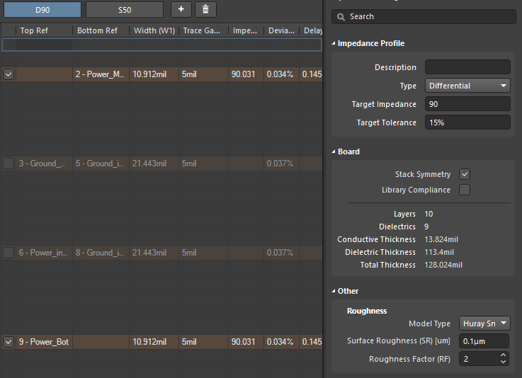 如果您要进行高速/高频设计,则可以使用内置的阻抗分析器来确保电路板中的阻抗控制。阻抗曲线工具使用Simberian集成的电磁场求解器来定制迹线的几何形状,以达到目标阻抗值。